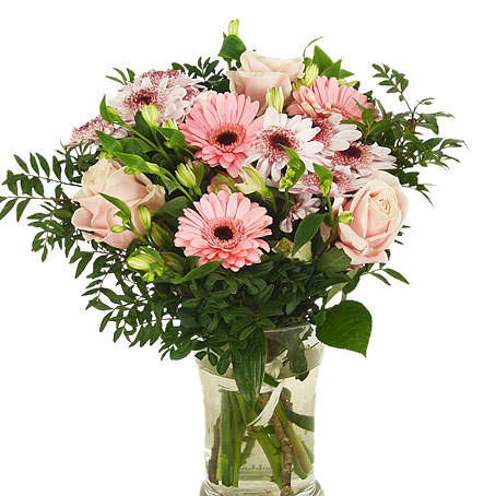 Rundbunden bukett med ljusrosa rosor, rosa germini, rosa santini, vit alstro och pistach.