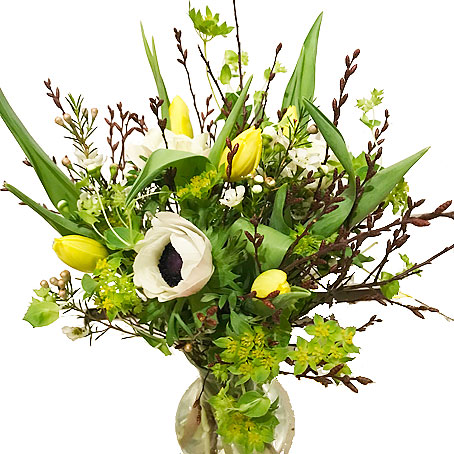 Rundbunden bukett med gula tulpaner, vit anemon, vit vaxblomma, bupleurum och kvistar.