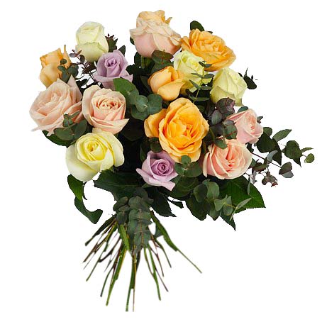 Rundbunden bukett med rosor i olika pastellnyanser. Lila, ljusrosa, aprikos, vit blandat med eucalyptus och salal. Bukett som antingen kan stå i vas eller på stjälkarna.