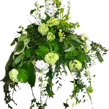 Den här begravningsdekoration kan med fördel placeras på en pedistal eller annan högre avsats p g a den vackra droppformen och hänget i buketten, men finns detta inte tillgängligt i kyrkan så är den jättevacker att placera på golvet framför kistan. I denna dekoration: Viburnum, lövkojor, franska tulpaner, murgröna, eucalyptus. Blommor varierar efter säsong.