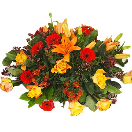 Låg rund begravningsdekoration i höstfärger med orange liljor, orange rosor, röd germini, orange santini, brun hypericum, och blandat grönt.