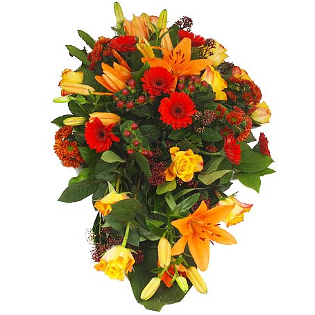 Låg  begravningsdekoration i höstfärger med orange liljor, orange rosor, röd germini, orange santini, brun hypericum, och blandat grönt.