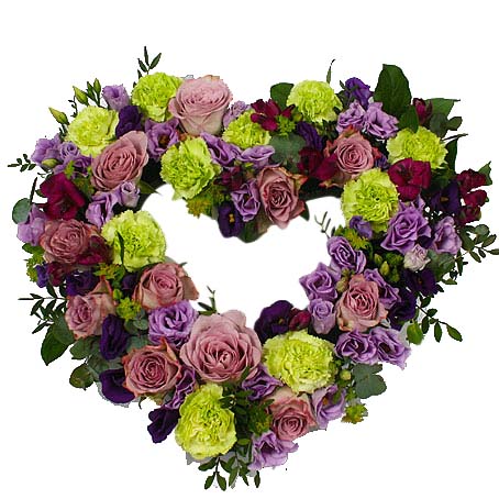 Öppet hjärta med säsongens blommor i lila och grönt. Blomsorterna kan variera efter årstiden.