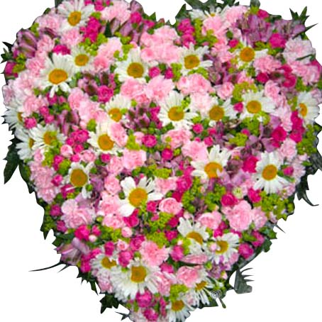 Fyllt hjärta med rosa sommarblommor, daggkåpa och prästkragar.