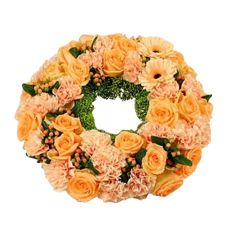 Rundbunden krans i aprikost med rosor, nejlikor, hypericum och germini.