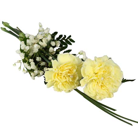 Handbukett med 2 st gula nejlikor med björngräs, brudslöja, läder. Matchande band och pärlnålar.