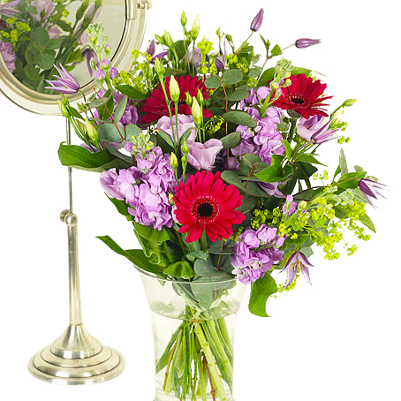 Bukett med cerise/röd germini, lila prärieklocka, lila lövkoja, lila klematis, daggkåpa och eucalyptus.