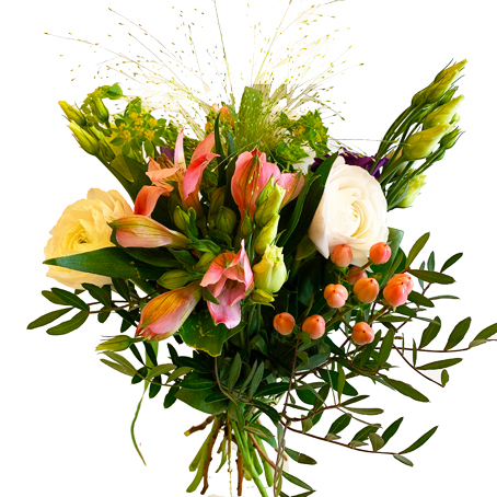 Rundbunden bukett med ranunkel i pastell, rosa alstroemeria, lila lisianthus, hypericum, bupleurum, fontängräs & pistage.
