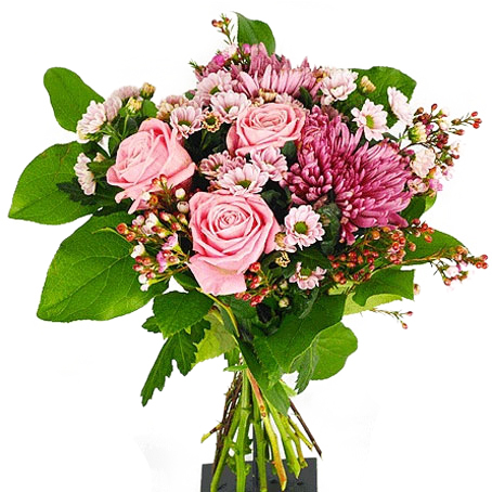 Rundbunden bukett med två rosa anastasia kryss, tre rosa rosor, rosa santini, rosa vaxblomma och grönt.