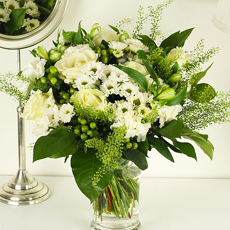 Rundbunden bukett med vita rosor, vita nejlikor, grön hypericum, vit santini, thalapsi och salal.