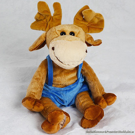 Plysch älg med hängslen. 40cm hög. Vi skickar bara blommor och presenter i Stockholm.