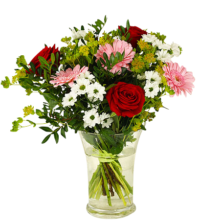 Rundbunden bukett med röda rosor, rosa gèrmini, vit santini, buplerum och pistach.