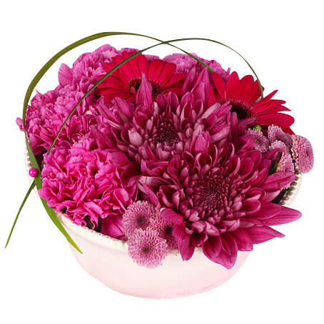 Lågt arrangemang i vit kruka med rosa/cerice blommor.
