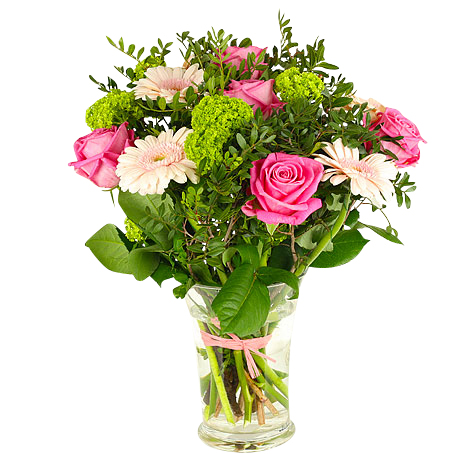 Rundbunden bukett med ljusrosa germini, rosa rosor, viburnum eller alchemilla och pistach.