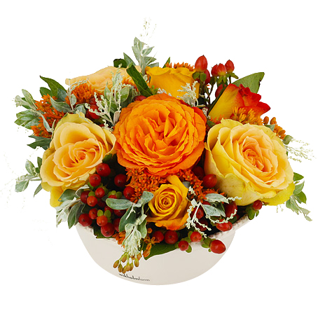 Låg snittdekoration i vit rund skål i orange, gula och aprikosa toner. Blommor varierar efter säsong.