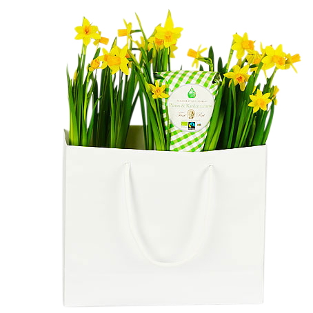 Härlig påskpåse med påskliljor/tet a tet i en presentpåse tillsammans med en chokladstrut.