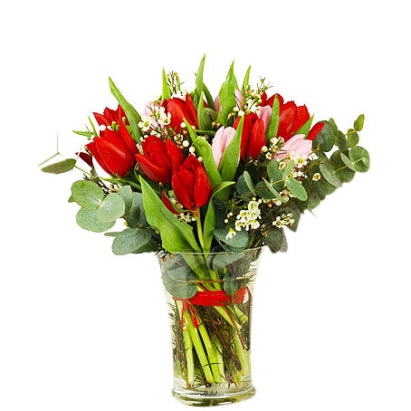 Bukett med rosa och röda tulpaner. Vit vaxblomma och storbladig eucalyptus.