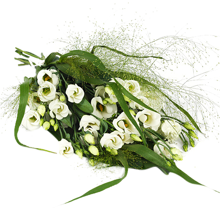 Begravningsbukett i traditionellt utförande med vita prärieklockor och fontängräs samt passande grönt.