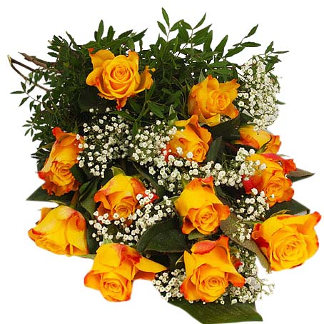 Begravningsbukett med orange rosor, brudslöja och grönt.