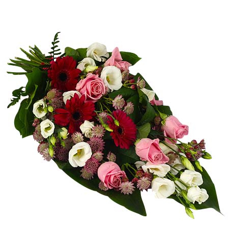 Begravningsbukett i traditionellt utförande med vita prärieklockor, cerise germini, rosa rosor och stjärnflocka. Aspidistrablad och grönt. Bundet med matchande bast.