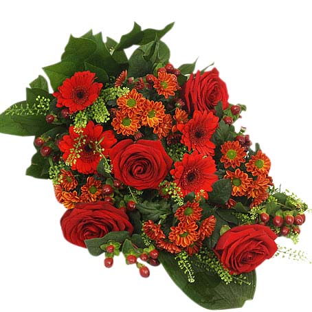 Begravningbukett med röda rosor, röd germini, orange santini, brun hypericum, thlapsi, och gröna blad.