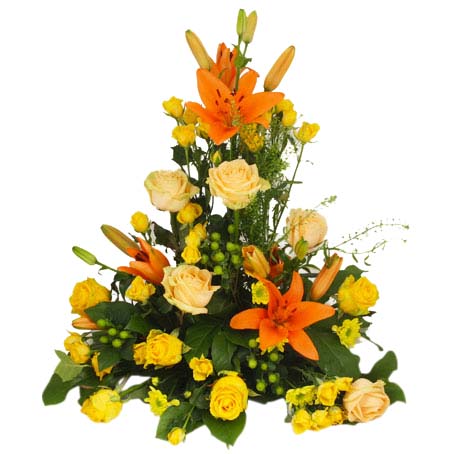 Hög begravningsdekoration med orange lilja, aprikosa rosor, gula rosor och kvistrosor, grön hypericum, thlapsi, blandat grönt.