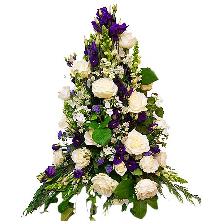 Hög begravningsdekoration i lila och vitt. Lila eustoma, vita lejongap, vita rosor, vit stjärnflocka och blandat grönt.