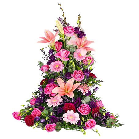 Hög begravningsdekoration i rosa och lila med rosa germini, rosa liljor,rosa rosor, blå prärieklocka, blå limonium, lila/bordeaux nejlikor och olika grönt.