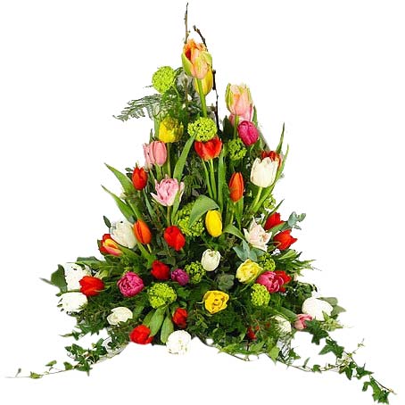 Hög begravningsdekoration i traditionell form med tulpaner i olika färger, viburnum, olika grönt och murgröna.