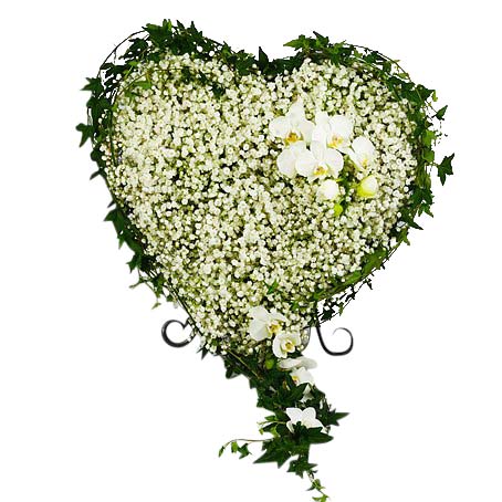 Fyllt hjärta med brudslöja och en kant av murgröna. Dekorerad med vita phalaenopsisorkideer.