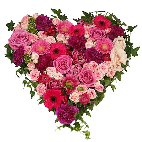 Fyllt hjärta med blommor i olika cerise/rosa toner och murgröna. Blommorna varierar efter säsong.