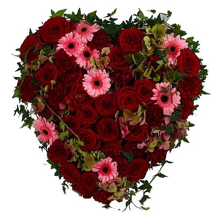 Fyllt hjärta med röda rosor, röda nejlikor, rosa germini, murgröna, hortensia.