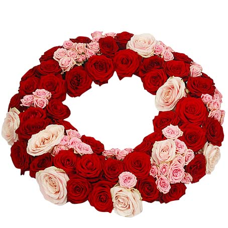 Rundbunden krans i rött och rosa med röda rosor, rosa rosor och rosa kvistrosor