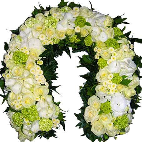 Ett formarbete utformat som en hästsko. Floristen skapar en fin kombination av vitt och grönt med säsongens blommor.