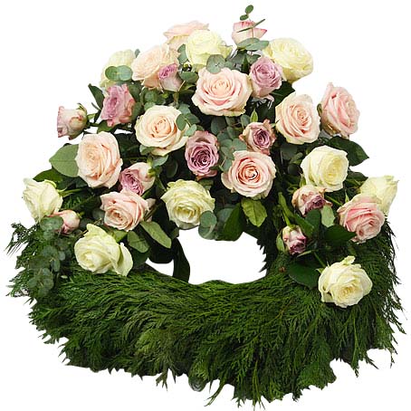 Krans på cypresstomme med rosor i mjuka pastellfärger