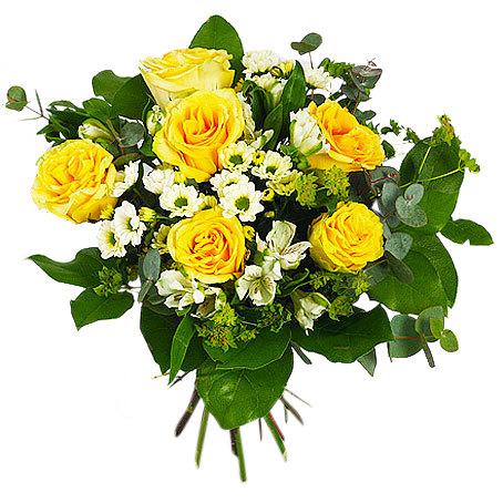 Rundbunden bukett med gula rosor, cremevita santini, vit alstro, buplerum, eucalyptus och salal.