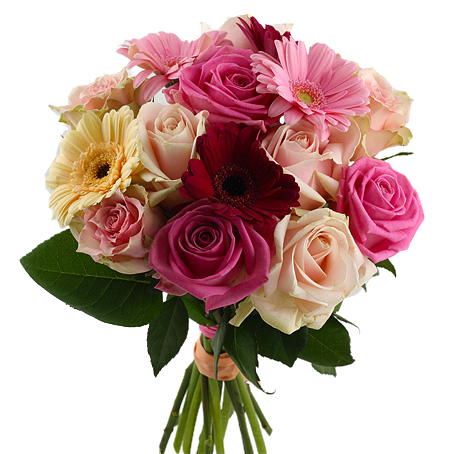 Rundbunden kompakt bukett med rosor och germini i olika rosa nyanser med inslag av starkt cerice/röd germini eller ros.