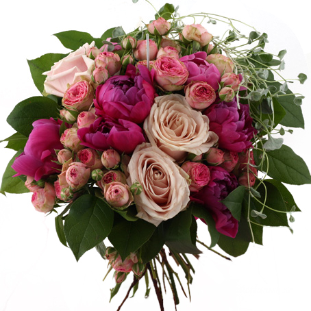Rundbunden kompakt bukett med cerice & rosa pioner, ljusrosa rosor, rosa kvistrosor, njurvinda (alt. murgröna) slingrande runtom och grönt.