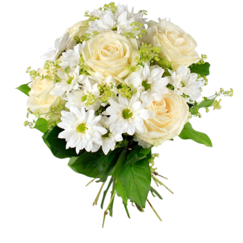 Rundbunden bukett med vita rosor, krysanthemum, daggkåpa och grönt.
