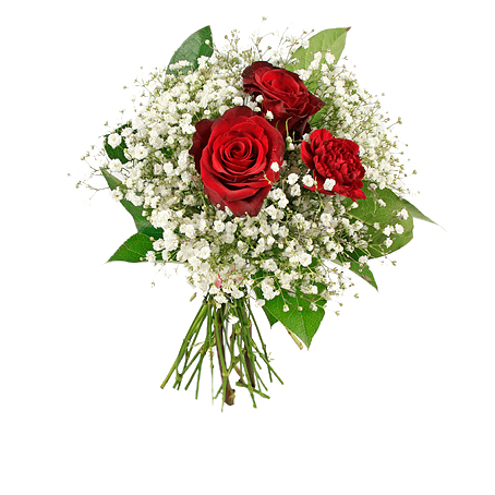 Låg kompakt bukett med brudslöja, 2 röda rosor, 1 röd nejlika placerat asymmetriskt, salal.
