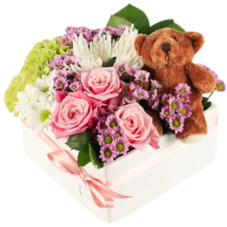 Lågt arrangemang till nyfödd med rosa band runt vit kruka med snittblommor i rosa/lila/vitt/grönt, samt en liten nalle.