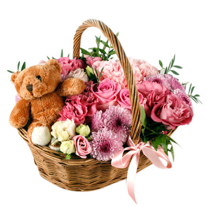 Snittarrangemang i Korg med nalle, säsongens blommor i olika rosa toner och en rosa rosett (korgen kan variera i utseende)