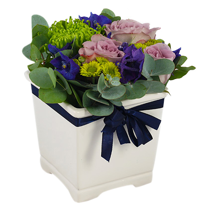 Snittarrangemang i vit kruka med säsongens blommor i mörklila, lila och lime toner och en blå rosett.