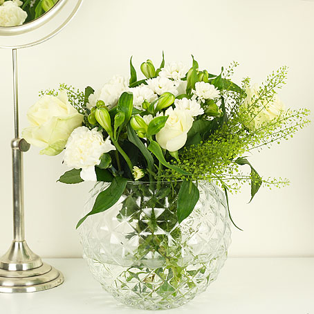 Rundbunden bukett med vita rosor, vita nejlikor, grön hypericum, vit santini, thalapsi och salal.