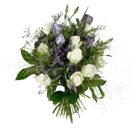 Rundbunden vit/lila bukett, vita rosor, lila prärieklocka, grönt.